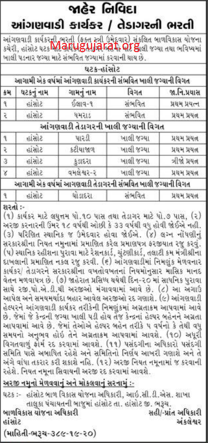 Integrated Child Development Scheme (ICDS) Hansot (Bharuch) has published a notification for the recruitment of Anganwadi Worker & Helper Posts 2019